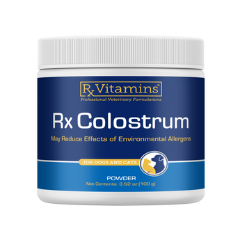 Rx Colostrum ist ganzes Rinderkolostrum aus der Erstmelkzeit, das über 100 bioaktive Komponenten enthält, von denen Immunglobuline, Zytokine und Leukozyten vorherrschen. Rx Colostrum moduliert das Magen-Darm- und Immunsystem und trägt so zur Linderung von Allergiesymptomen bei. Haustiere profitieren sowohl prophylaktisch als auch therapeutisch und genießen gleichzeitig die schmackhafte, effiziente Pulververabreichung.