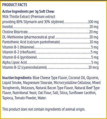 Hepato Support Soft Chews are a palatable, veterinarian-formulated supplement designed to support normal liver function in dogs and cats. These soft chews feature Milk Thistle Extract standardized to 80% Silymarin and 30% Silybinin, along with Inositol, Choline, DL-Methionine, and B-vitamins — nutrients that can aid in supporting liver health. Suitable for long-term use and safe for cats with dose adjustment.