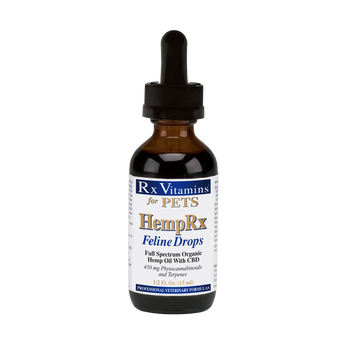 HempRx Feline Drops innehåller en standardiserad mängd eteriska oljor extraherade från hela hampaväxten odlad både ekologiskt och inhemskt. Denna eteriska olja är rik på terpener, flavonoider och fytocannabinoider. HempRx Feline Drops levereras i 15 ml flaskor med en graderad droppare av glas, och har blandats med organisk hampfröolja för att producera en behaglig vätska med en doftande blombukett. HempRx Feline Drops är det enda hela hampaxtraktet som är tillgängligt exklusivt för veterinärer, och upprätthåller de höga kvalitetsstandarder som veterinärer har förväntat sig av Rx Vitamins.