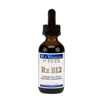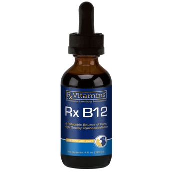 Vitamin B12 har traditionellt administrerats parenteralt för kroniska enteropatier och EPI. Det kan vara utmanande för kunder att ta in sina husdjur varje månad för dessa injektioner. Nyligen genomförda studier har funnit att daglig oral administrering av cyanokobalamin lika effektivt ökar serumkobalaminnivåerna som månatliga injektioner. Rx Vitamins introducerar stolt Rx B12, i ett mycket välsmakande flytande format för enkel och bekväm oral administrering av cyanokobalamin till dina patienter. Flaskan på 120 ml kommer att försörja en större (>50 pund) patient i en månad, och för en patient som väger mindre än 25 pund kommer den att hålla i 4 månader.